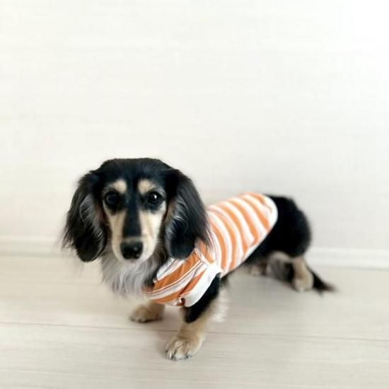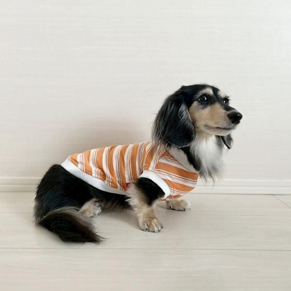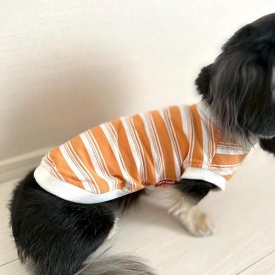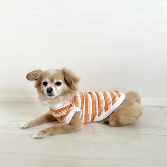 愛犬と一緒にお揃いのアメリカンボーダーデザインが可愛い犬用オレンジ×ホワイトの犬服をご紹介します。洗練されたボーダーデザインが、愛犬を一層可愛らしく見せてくれます。ウォッシュデニムとオフホワイトの色合いが、柔らかな印象を与え、どんな色合いにもマッチします。